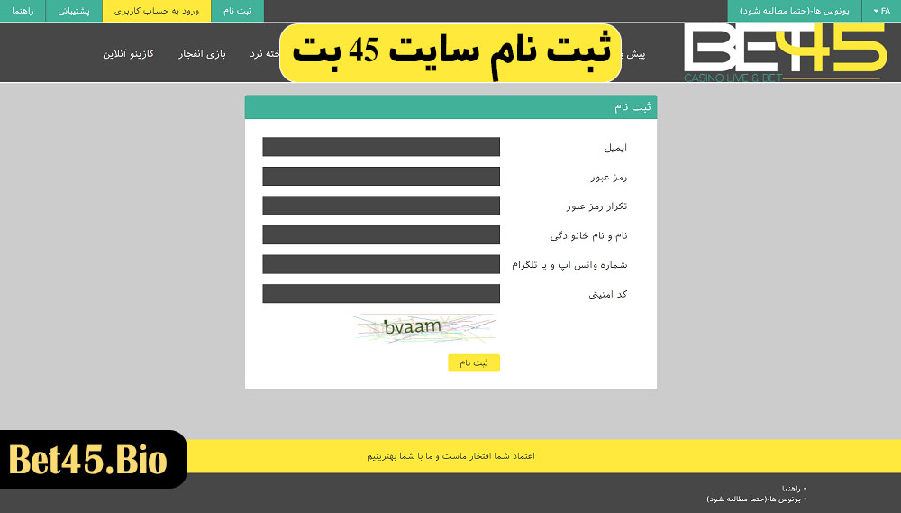 پس از ورود به سیستم، از شما خواسته می شود اطلاعات درخواست شده در فرم ثبت نام Bet45 را پر کنید. اطلاعات مورد نظر بسیار ساده است و هیچ پیچیدگی ندارد.