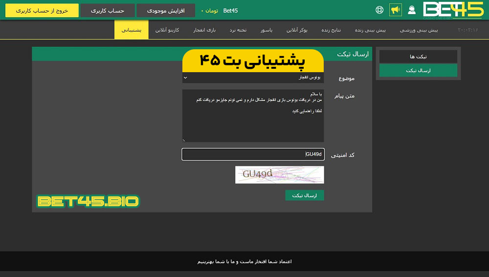 در سایت bet45 به جز تیکت راه دیگری برای تماس با پشتیبانی وجود ندارد ولی سرعت پاسخگویی بسیار بالا می باشد